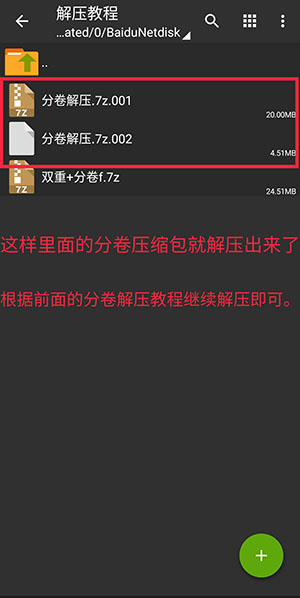 格式为文件名.7z.00x,例如文件名.7z.001、文件名.7z.002、文件名.7z.003,这个X代表分卷数量,缺一不可。在这里主要说zarchiver的使用,所以没有包括百度网盘文件下载的过程,不过我相信这个难不到你们,就长按下载的事。